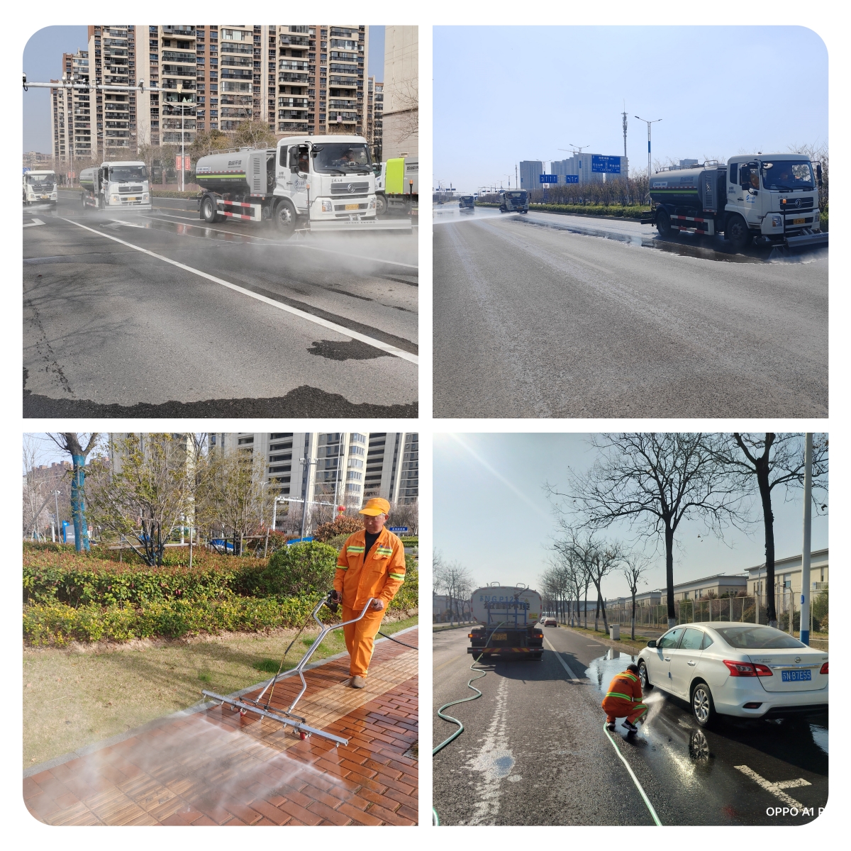 “平面”清洗,“洗”道路本色。采用“洗、沖、刷、掃”組合作業(yè),高壓清洗車、灑水車、洗掃車協(xié)同“作戰(zhàn)”,對園區(qū)主次干道進行了深度清洗,確保道路恢復本色,標線清晰。針對人行道、交叉路口、停車泊位等大中型車輛作業(yè)盲區(qū),使用小型高壓清洗車和人工沖洗進行“補位”作業(yè),確保無盲區(qū)、無死角,實現(xiàn)清潔全覆蓋,讓園區(qū)每一條道路都“煥然一新”。