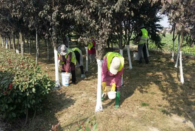 樹干涂白,目的是防治病蟲害和延遲樹木萌芽,還可以提高苗木抗寒、抗病蟲害能力,保樹木安全過冬,為明年樹木良好生長打下基礎。